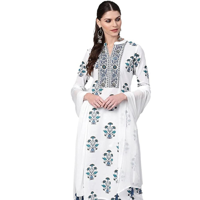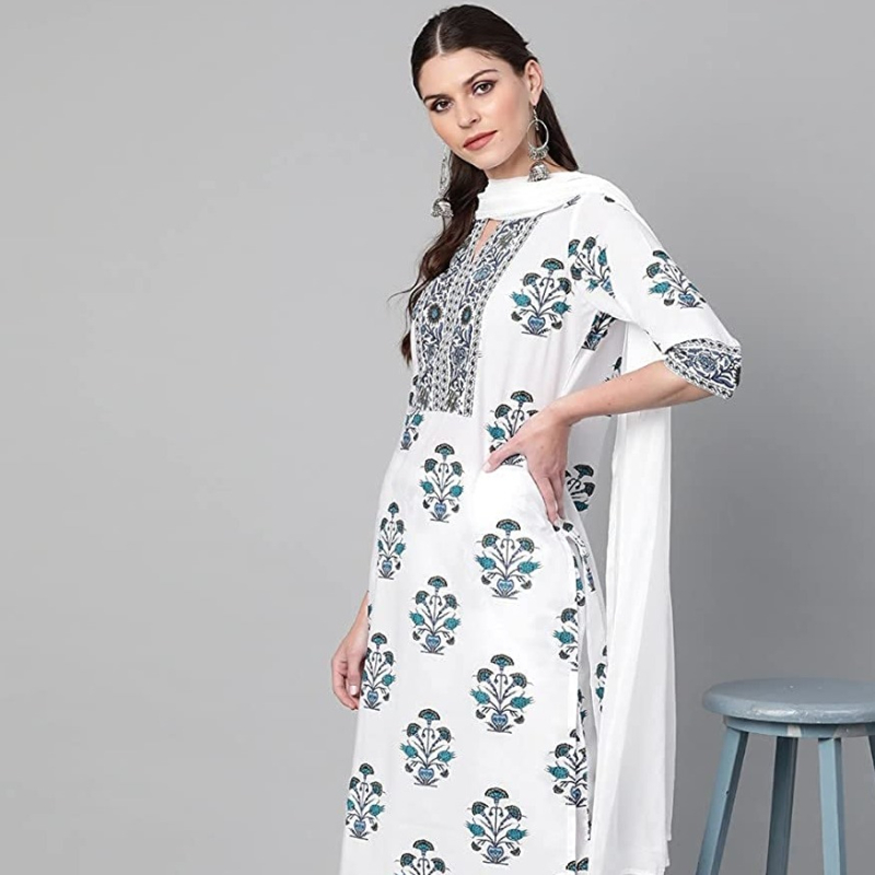 • This set includes: 1 Kurta and 1 Pants with Dupatta || Work : Printed || Neck Style:- Round Neck