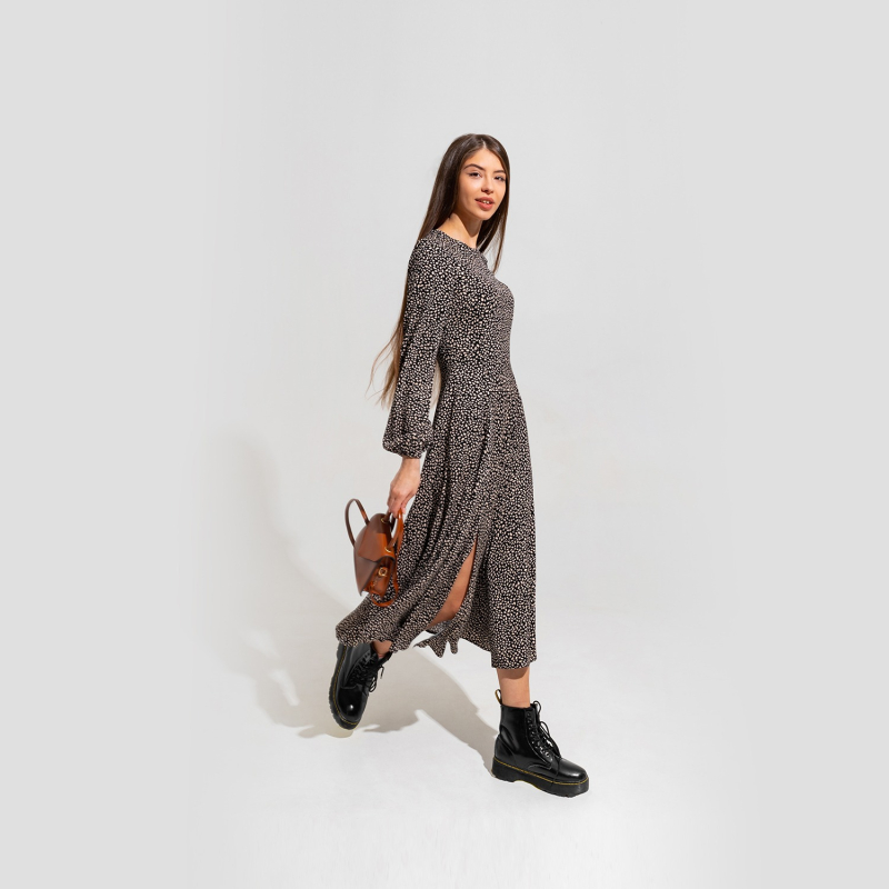 فستان أسود مع طبعات بيضاء منقطة ، له رقبة مستديرة ،