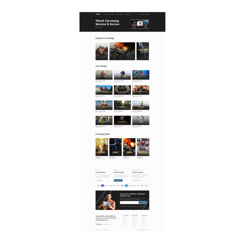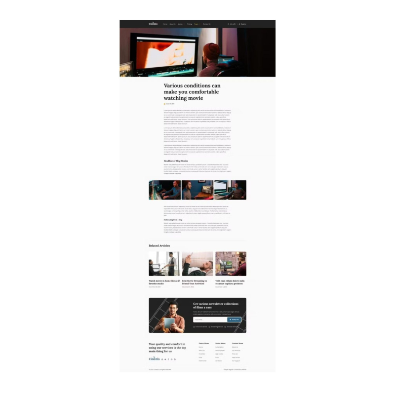 تم تصميم cinemo - video streaming website elementor template kit لوكالات بث الفيديو التي ترغب في عرض أعمالها أو خدماتها أو محتواها. تدعم مجموعات القوالب هذه عرض الجوال سريع الاستجابة. هذا ليس موضوع وورد. تحتوي مجموعات القوالب على محتوى صفحة لمنشئ صفحة elementor. تم تحسين هذه المجموعة للاستخدام مع سمة hello elementor المجانية ولكن يمكن استخدامها مع معظم السمات التي تدعم elementor.
