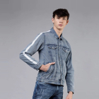 سترة الدنيم الزرقاء المغسولة ، لديها طوق منتشر ، 2 جيوب ، زر إغلاق ، أكمام طويلة ، حافة مستقيمة ، بطانة غير مبطنة ولها جيوب وهمية للصدر.