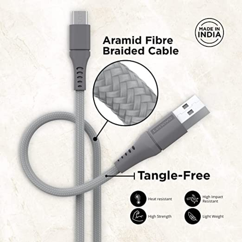 كابل لينوفو مايكرو يو إس بي خالي من تشابك الأراميد بطول ١ متر مع شحن 4 أمبير ونقل بيانات بسرعة 480 ميجابت في الثانية، عمر افتراضي معتمد يزيد عن 10000 انحناء، رمادي معدني