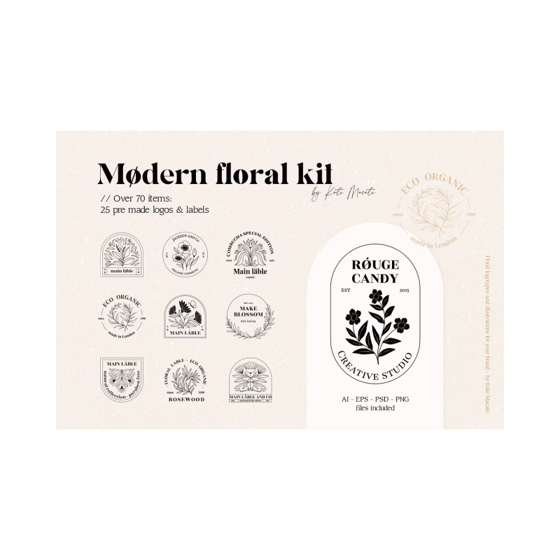 MODERN FLORAL KIT عبارة عن مجموعة ضخمة من الشعارات والملصقات والرسومات العصرية. ما عليك سوى إضافة السحر إلى تصميماتك وسوف تتألق بألوان جديدة.