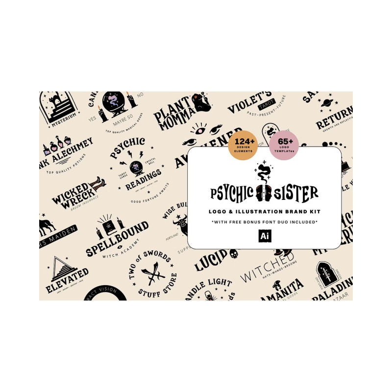 شعار متميز وحزمة توضيح. رسومات ذات طابع صوفي مع مشاعر ساحرة وروحية. قوالب شعار مسبقة الصنع ، وعناصر رسومية داعمة لإنشاء تصميماتك الفريدة.