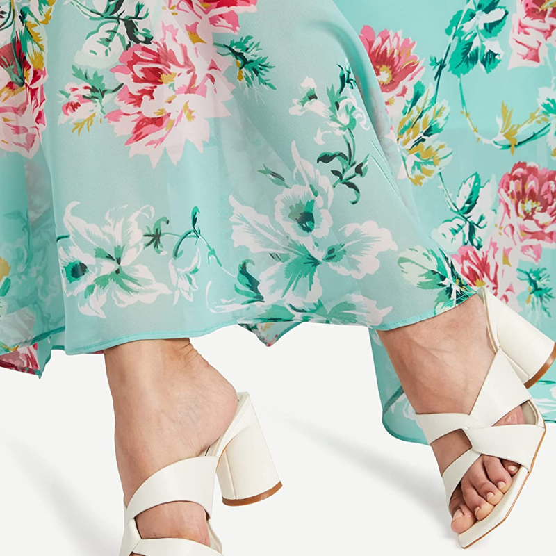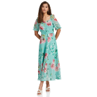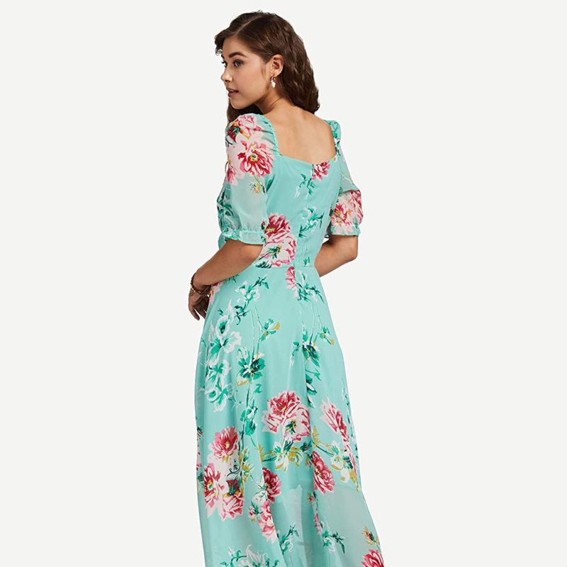 المرأة عارضة الأخضر الأزهار ماكسي حبيب الرقبة أكمام قصيرة تناسب وتوهج اللباس
