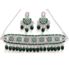 قلادة قلادة قلادة تقليدية مرصعة بالحجر باللون الأخضر والوردي مطلية بالفضة مع أقراط مجوهرات