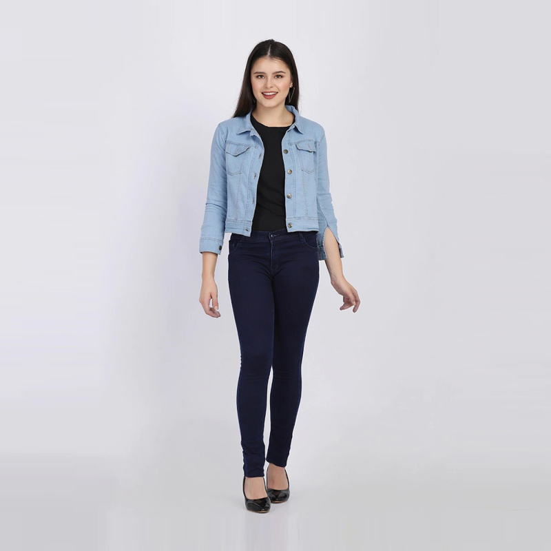 سترة الدنيم الصلبة الصلبة خفيفة الوزن ، لديها طوق انتشار ، 2 جيوب ، لديه زر إغلاق ، ثلاثة أرباع الأكمام ، حاشية مستقيمة ، بطانة قطنية.