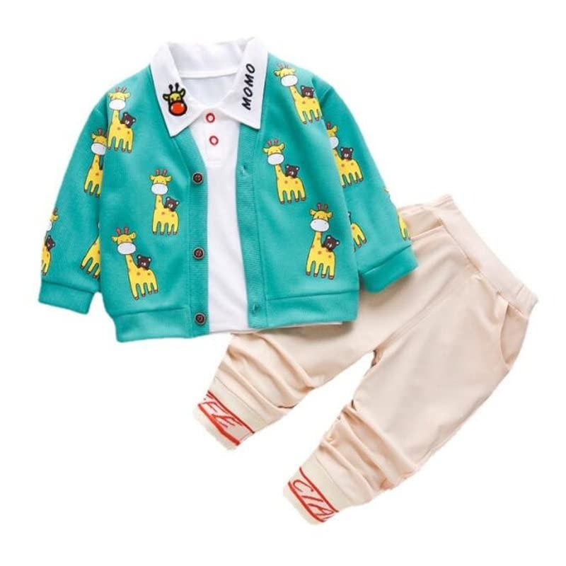 • Do you love giraffes? If yes bring one home today! The most comfortable outerwear, which comes in bright and beautiful colors, these buttoned cardigan jacket with t shirt and jogger pant set make promising winterwear collection for kids this season.