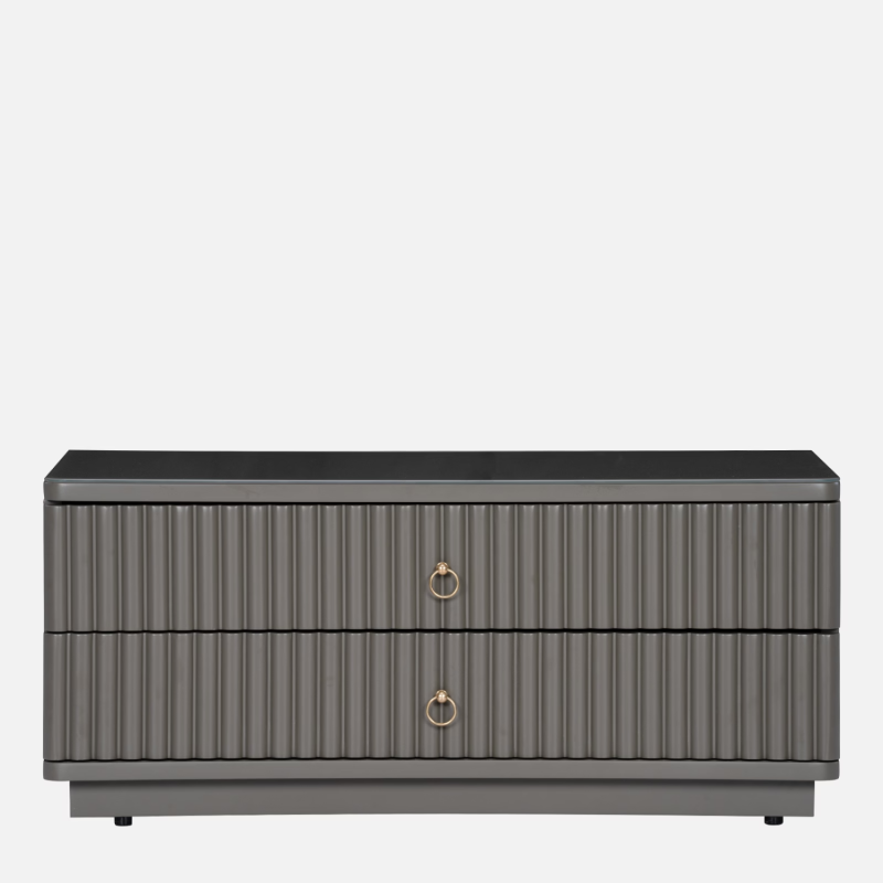 • Base masterfully crafted of premium engineered wood in beige-grey lacquered polish.