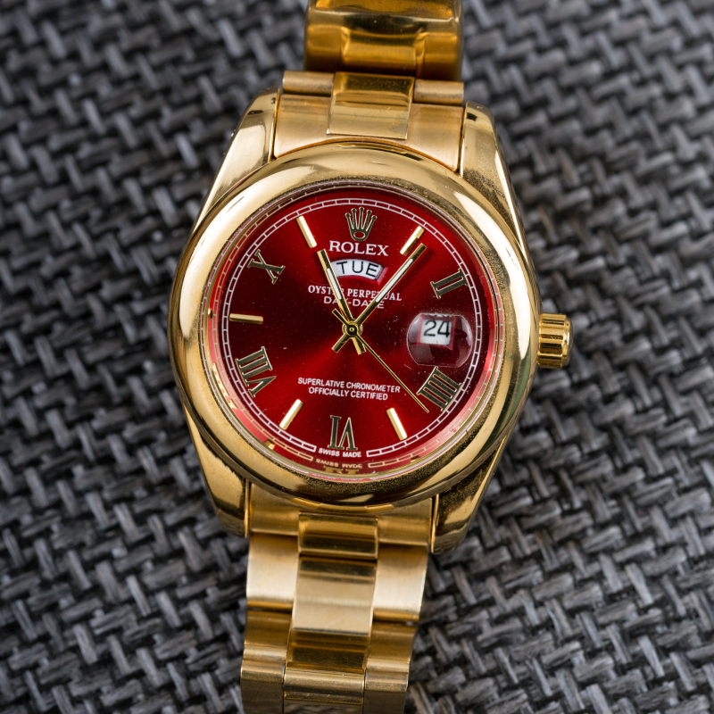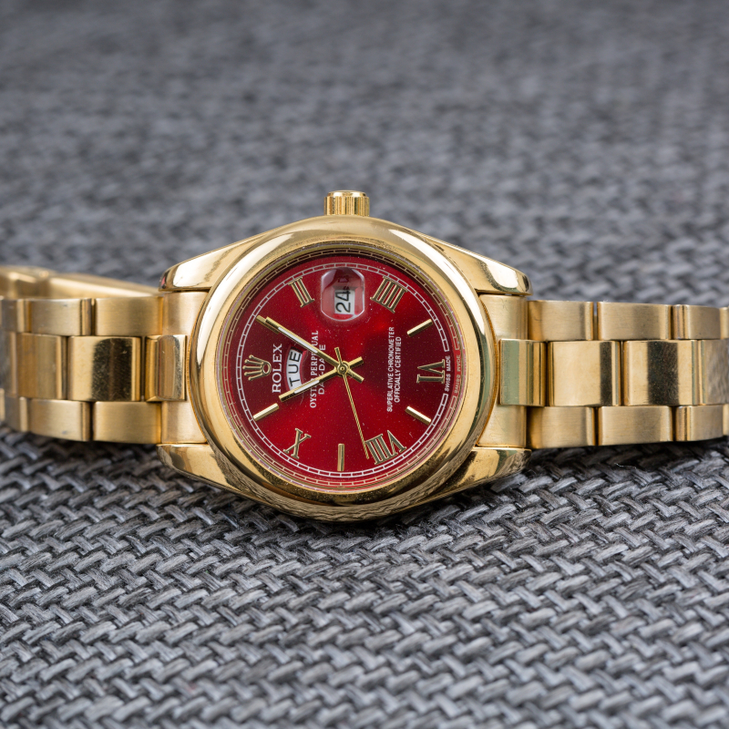 This Oyster Perpetual DAY-DATE 40 in 18 CT yellow gold with a red dial, fluted bezel and a president bracelet.