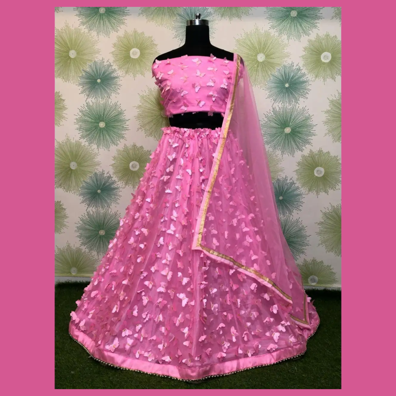 DESIGNER NET 3D BUTTERFLY WORK LEHENGA CHOLI WITH DUPATTA PINK