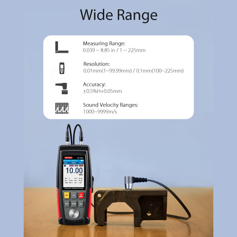 • Fast & Accurate: The ultrasonic thickness gauge measuring ranges from 0.039 to 8.85 in/1 to 225mm, Resolution: of 0.01mm. you can get accurate (±0.5%H+0.05mm) readings in inches or mm in 0.5 seconds.