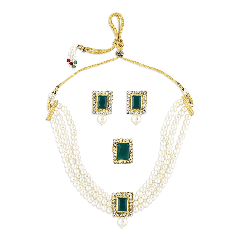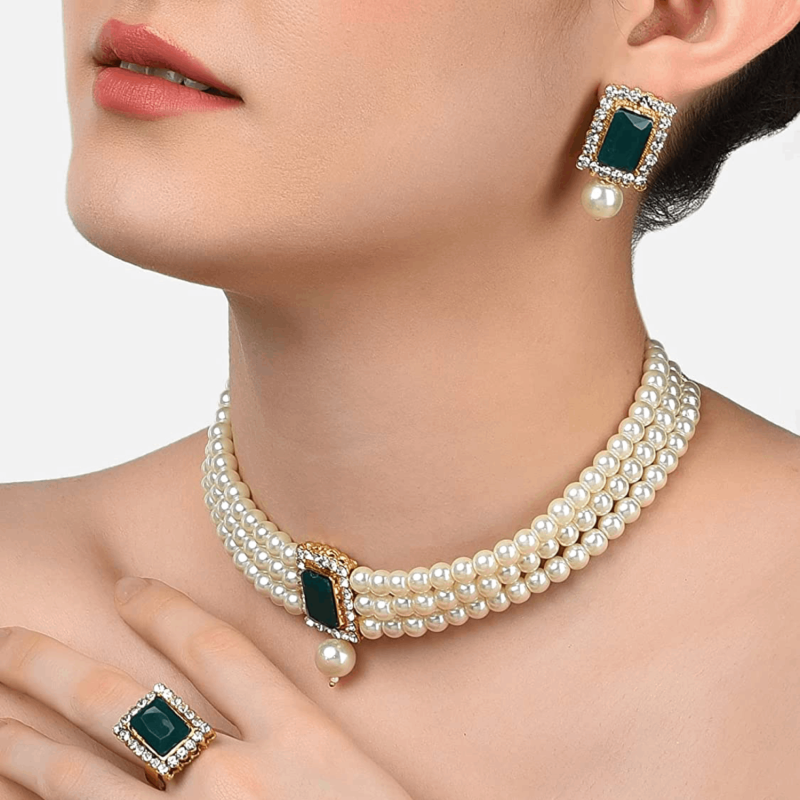 • Color: Green, Plating: Yellow Gold, Material: Alloy, Stone: Austrian Diamonds & Pearls