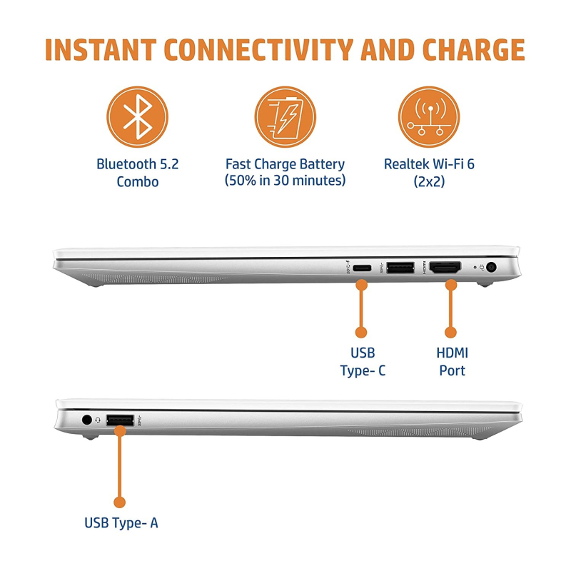 • Ports: 1 SuperSpeed USB Type-C 10Gbps (USB Power Delivery, DisplayPort 1.4, HP Sleep and Charge), 2 SuperSpeed USB Type-A 5Gbps, 1 headphone/microphone combo, 1 AC smart pin, 1 HDMI 2.0 | 3-cell, 43 Wh Li-ion Battery, Supports battery fast charge: approximately 50% in 30 minutes