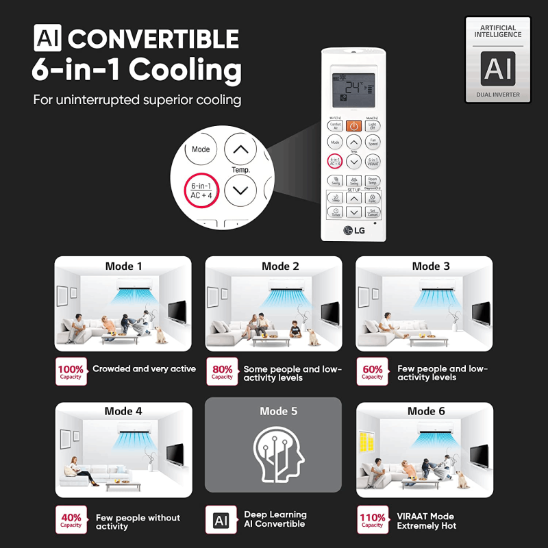 • Split Ac with Inverter Compressor: Variable speed compressor which adjusts Power depending on heat Load. With AI Convertible 6-in-1 user gets the flexibility to increase or decrease cooling capacity as per requirements
