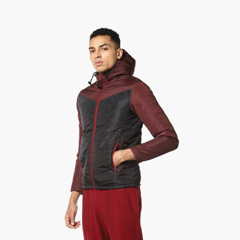 • Maroon and Black colourblocked jacket, has a hooded, 2 pockets, zip closure, long sleeves, straight hem, and polyester lining.