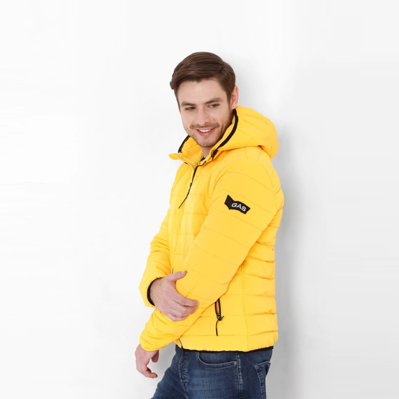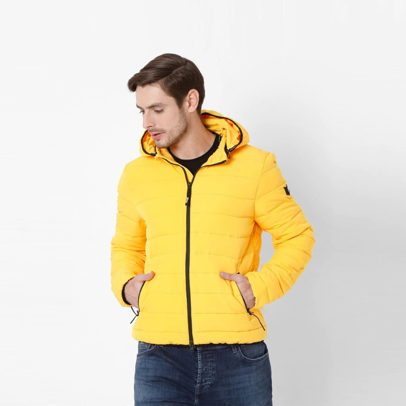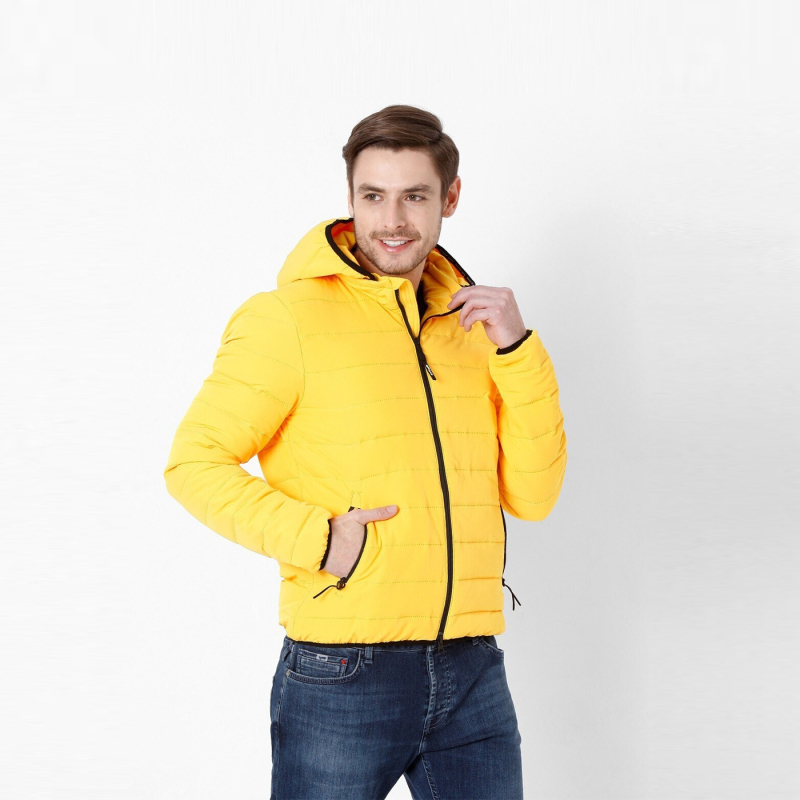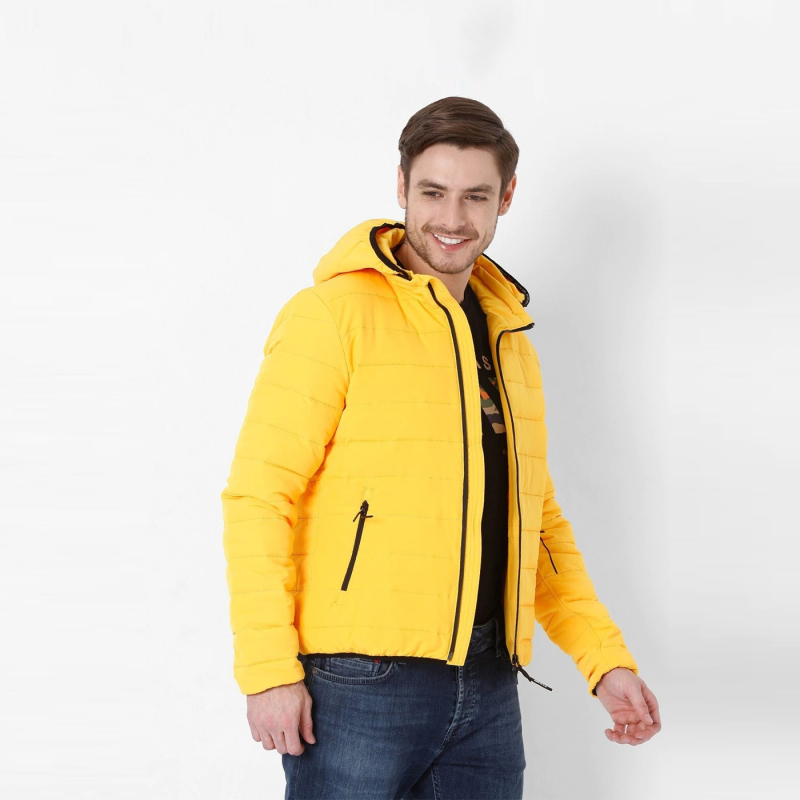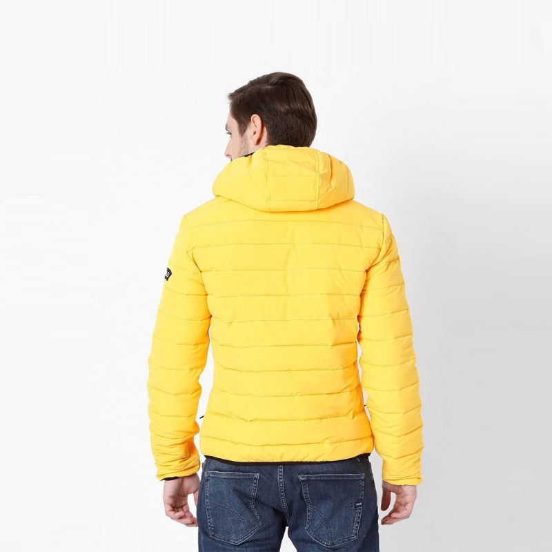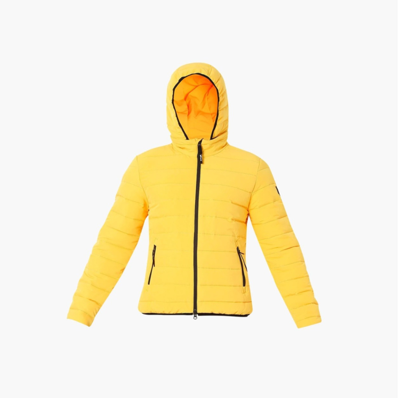 • Yellow striped puffer jacket, has a hooded, 2 pockets ,has a zip closure, long sleeves, straight hemline, polyester lining.