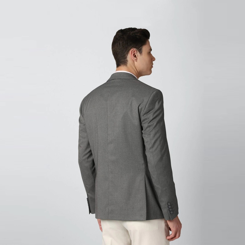 • Grey self design slim fit formal blazer, has a notched lapel collar, long sleeves with buttons, single breasted with button closures,2 mock pockets with flaps ,1 pocket on chest and 2 internal pockets, attached lining, double vented back hem.