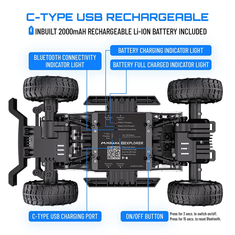 • Mirana App: Connect your Mirana Explorer to the Mirana mobile app to enjoy playing this 4WD. The Mirana mobile app is absolutely free. You can download it from Google Play Store or App Store for Android and iOS devices respectively. Simply, connect it to the Mirana Explorer via Bluetooth on your smartphone, feed in your credentials and you’re all set to play with it.