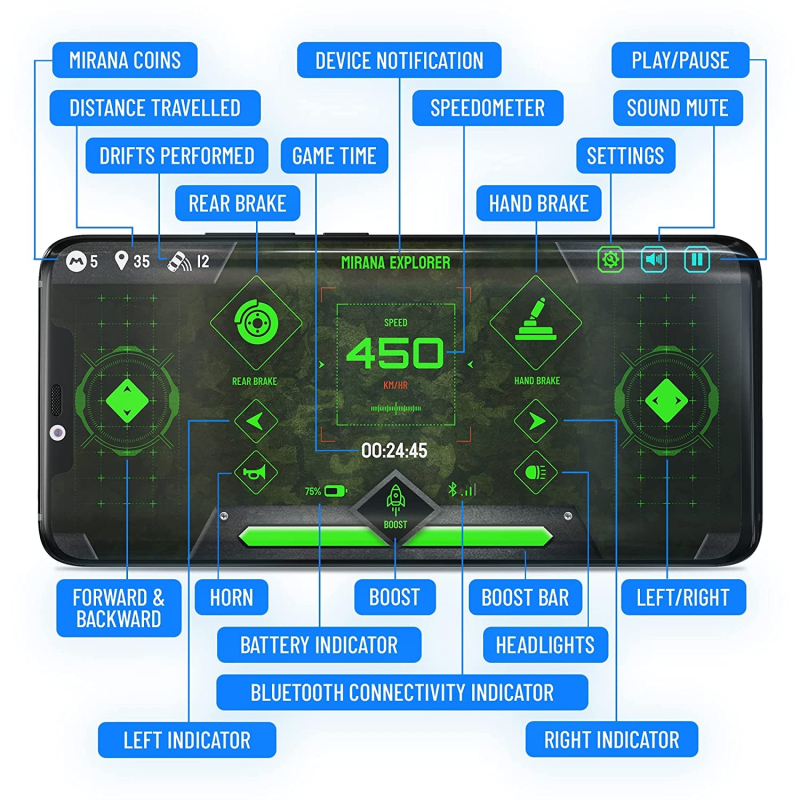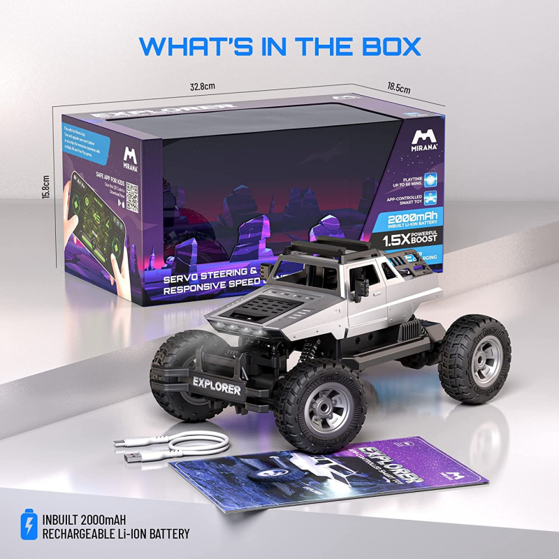 • Mirana App: Connect your Mirana Explorer to the Mirana mobile app to enjoy playing this 4WD. The Mirana mobile app is absolutely free. You can download it from Google Play Store or App Store for Android and iOS devices respectively. Simply, connect it to the Mirana Explorer via Bluetooth on your smartphone, feed in your credentials and you’re all set to play with it.