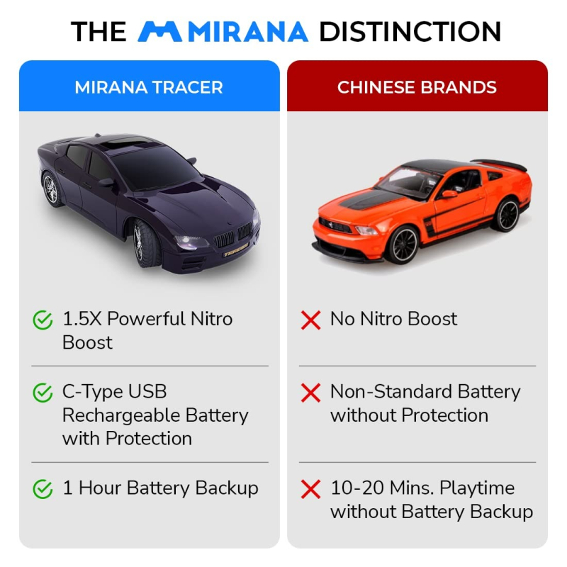 • Made In India: Indian Racing Car having with Long Lasting Battery Backup. Completely designed and manufactured in India align with the Mirana app