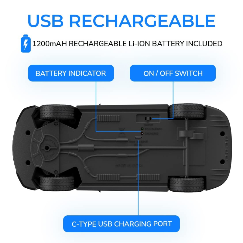 • USB Rechargeable: The two-wheel-drive car has a powerful motor to keep it rolling for up to 45 minutes with a rechargeable C-type charging port that requires about 1 hour to charge fully.