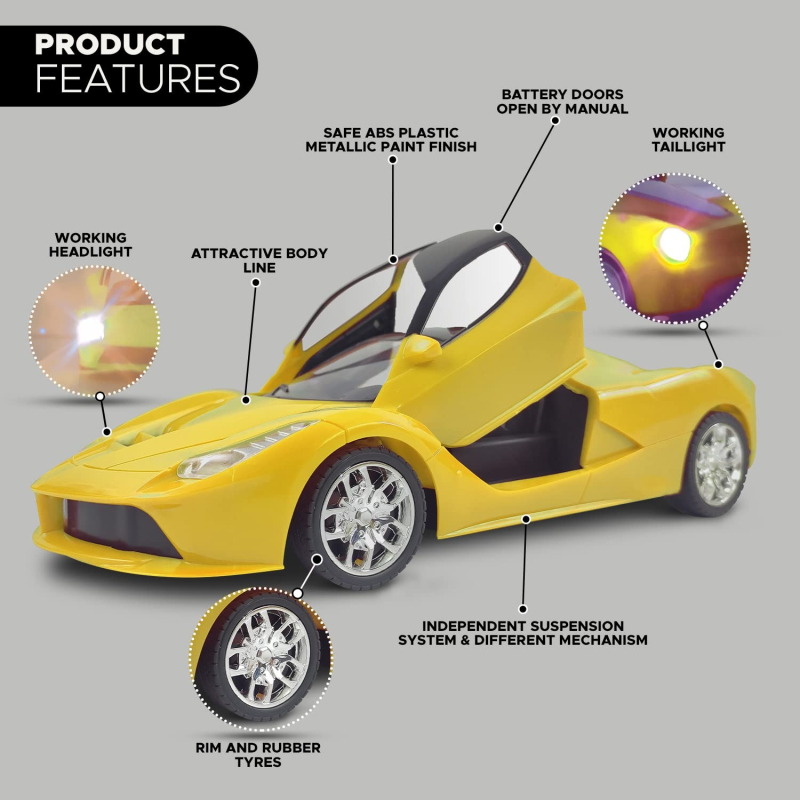 • Car doors open and close in style and can be remote controlled. LED head lamps make it even more appealing.