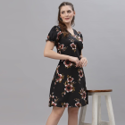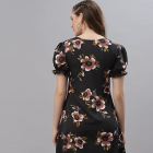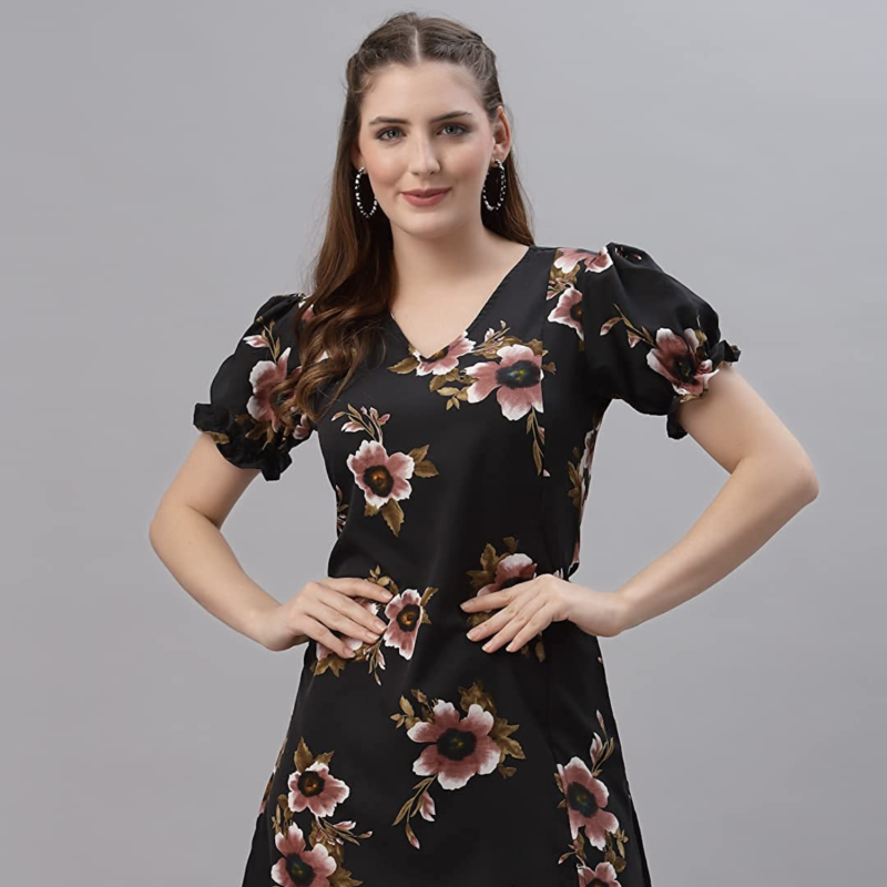 • Oomph! Mini/Short A-line Black dress in Crepe fabric with V Neck and Puff Sleeves
