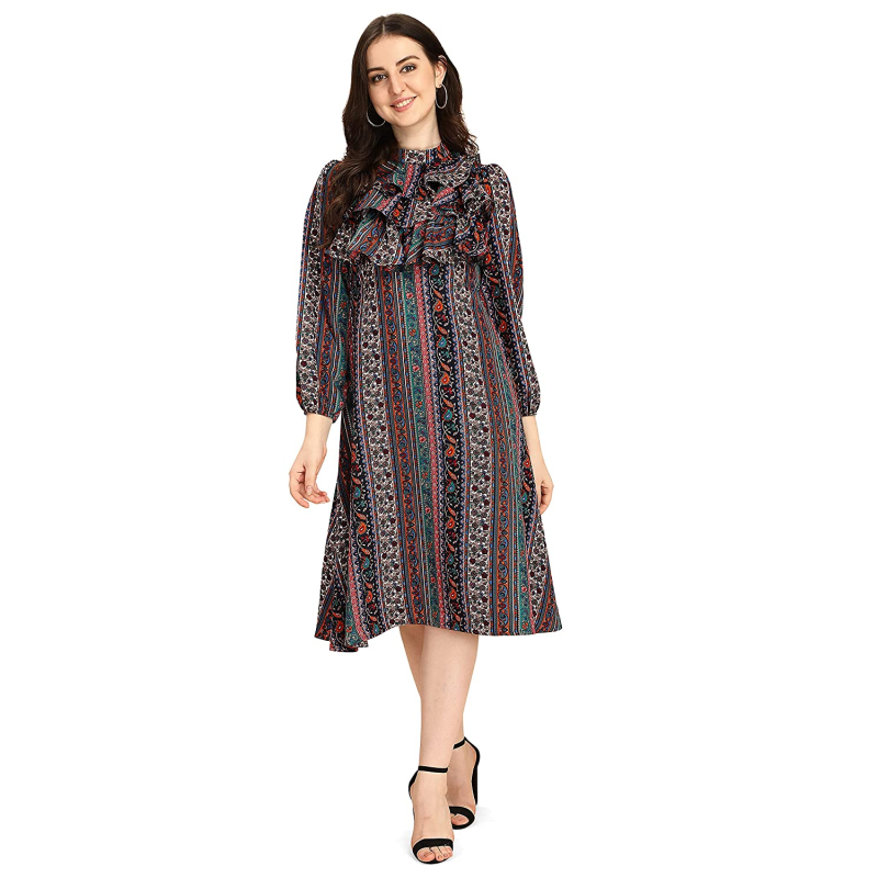 Garment is made of crepe, which drape well on all body types