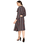 Flared dress with high collar with ruffle detail in collar and plakett. Long puffed sleeves, knee length.