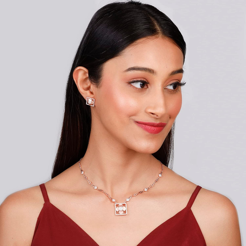 • PRODUCT DETAILS : Made of 925 Silver with Rose Gold Plating, AAA+ Quality Zircons, Includes a necklace and a pair of earrings, Necklace Charm: 1.9 cm x 1.9 cm. The length of the necklace is 42 cm with a 3 cm adjustable portion. Earrings Dimensions: 1.4 cm X1.4 cm