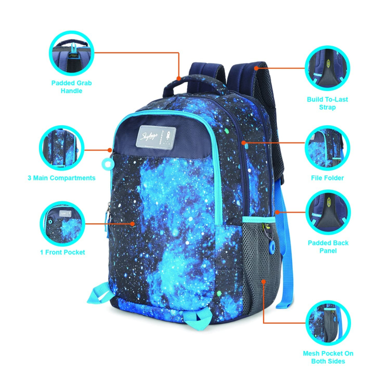 • Combination of functional & safety features in stylish design. 3 Spacious Main Compartment 1 Front Zip Pocket Printed Design 10 mm Padded Buildt to last Strap Fabric Bottle Holder on the side.