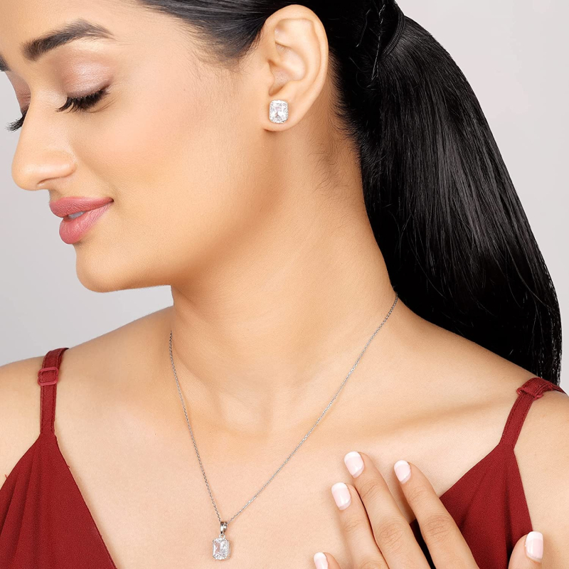 • PRODUCT DETAILS : Made of 925 Silver, Contains a pendant with a link chain and a pair of earrings, Charm: 1.9 cm x 0.85 cm, Length of necklace is 43 cm with 4 cm adjustable portion, Earring dimension: 1 cm x 0.85 cm. Rhodium finish to prevent tarnish