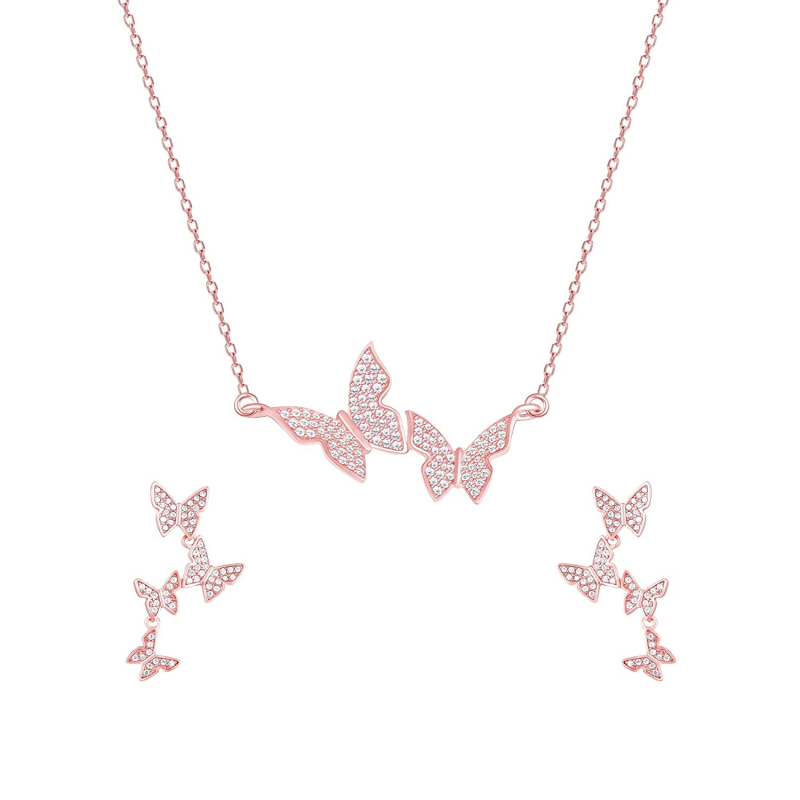 • PRODUCT DETAILS : Made of 925 Silver with Rose Gold Plating, Contains one pair of earrings and a necklace, AAA+ Quality Zircons, Perfect for sensitive ears, Charm: 1.6 cm x 3.1 cm. The necklace length is 45 cm and the adjustable chain is 4 cm, Earrings Dimensions: 3.1 cm x 1.43 cm. Rhodium finish to prevent tarnish