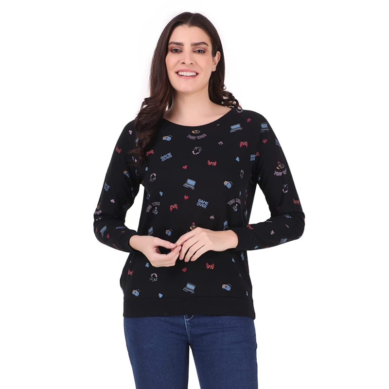 • This Ladies Casual sweatshirt features an over-graphic print, Raglan sleeves, and a round neck. Fabric: 100% Combed Cotton, 300 GSM. No Pilling effect and color fading even after Multiple Washes and repeatedly use.