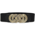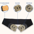 This stretchy belt is made up of 70% Polyester, 25% Elastane, 5% PU Leather and metal fastening buckle, easy and convenient to wear and take Off.