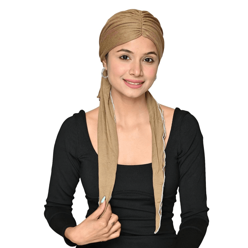 Material: 95% Bamboo Viscose & 5% Elastane Breathable soft natural Cap. Gathers at front and ruffles at the back.