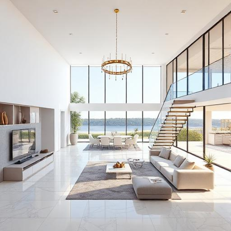 Lavish Living Spaces: Expansive living and dining areas featuring Italian marble flooring, double-height ceilings, and floor-to-ceiling glass windows for abundant natural light.