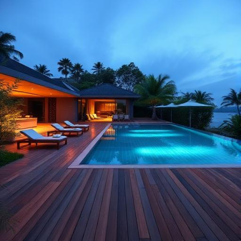 Temperature-controlled infinity pool with deck lounge area for relaxation and entertainment.