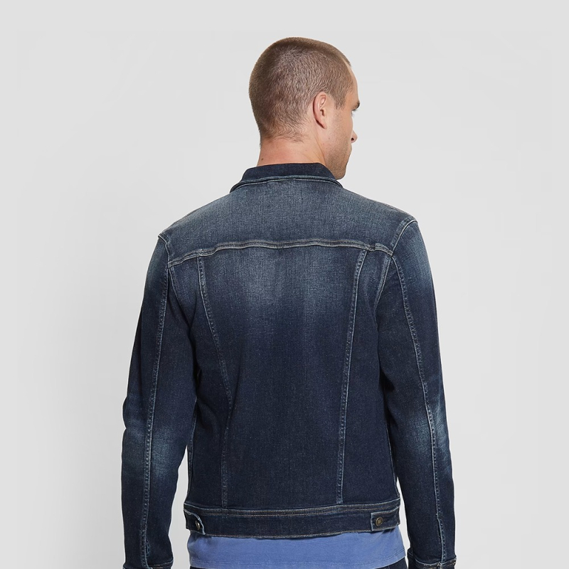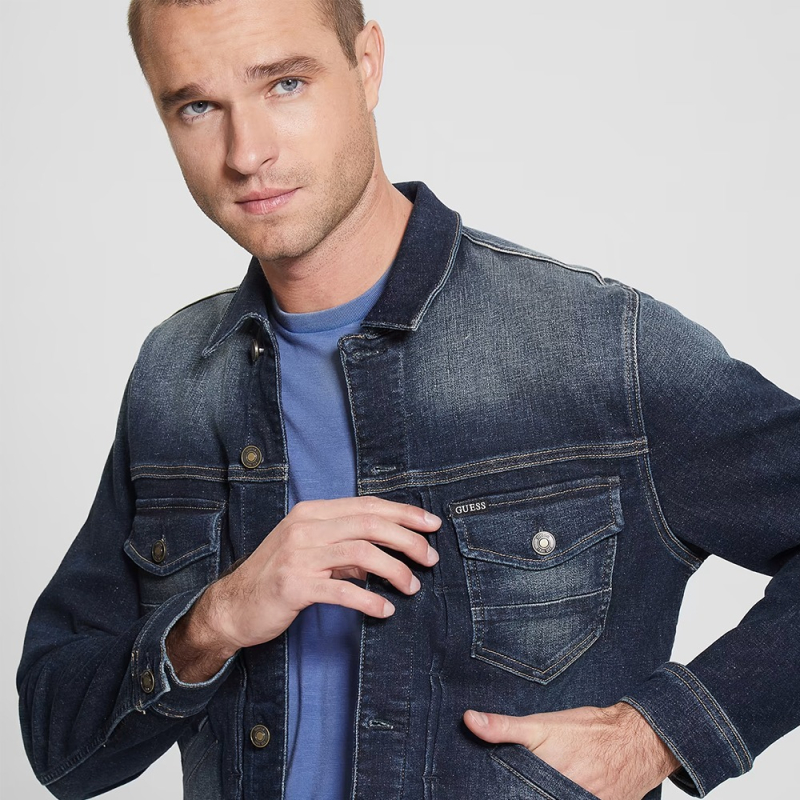 • Featuring a traditional trucker jacket design, it includes a pointed collar, button-front closure, and chest flap pockets with button details.