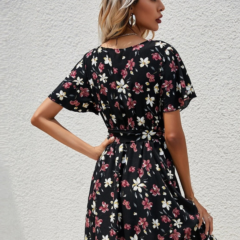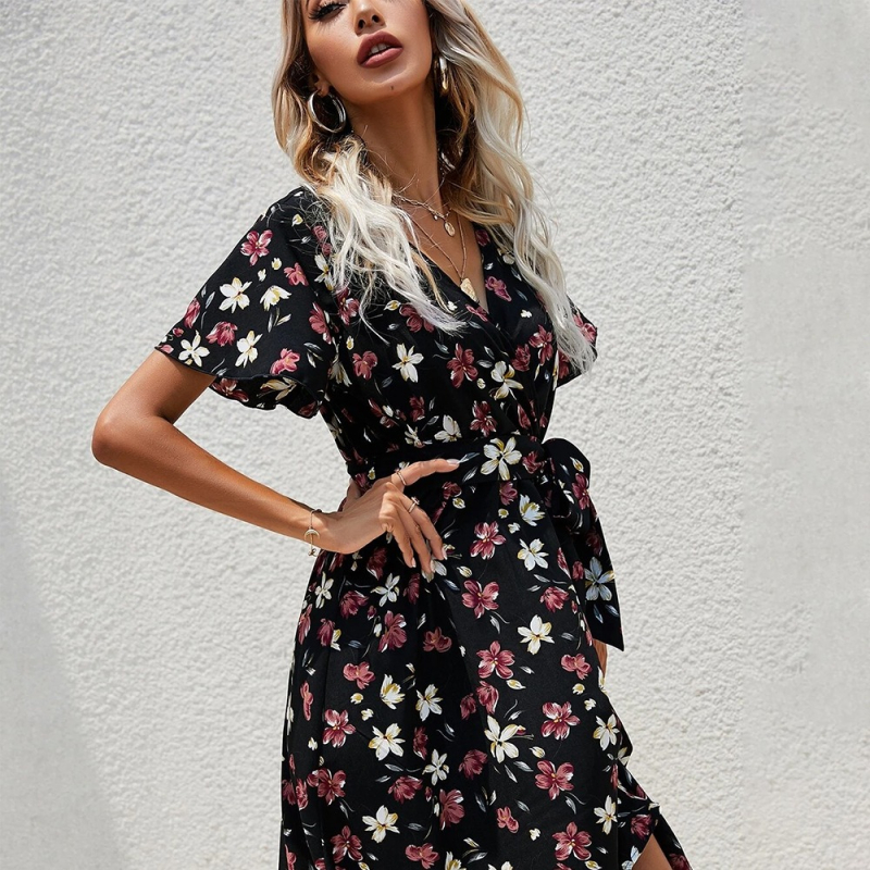 Women Black & White Printed Wrap Belted Dress