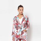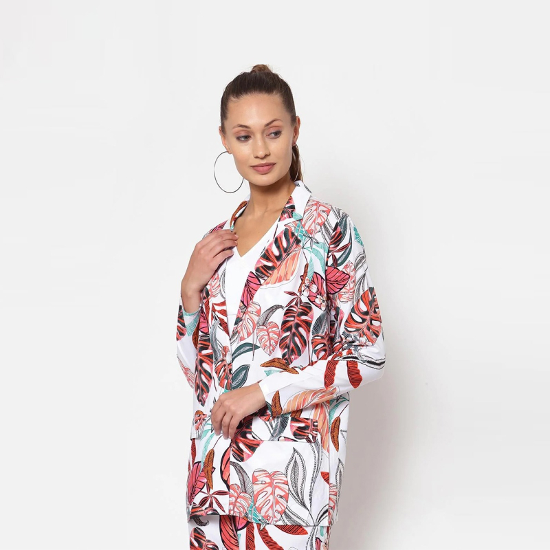 White floral printed single breasted blazer, has a notched lapel collar, short sleeves